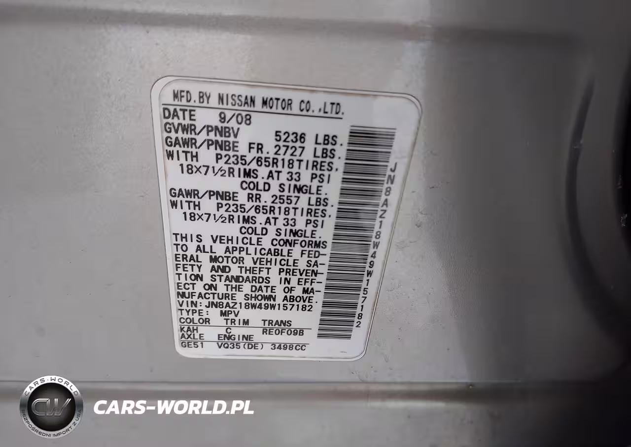 IAAI Nr: I-44258223 VIN: JN8AZ18W49W157182 Port: Indianapolis, IN