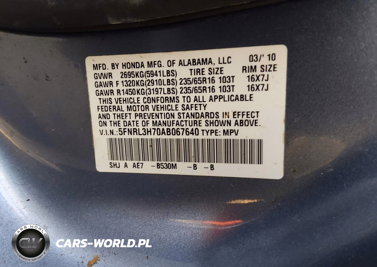 IAAI Nr: I-44276836 VIN: 5FNRL3H70AB067640 Port: Elizabeth, NJ