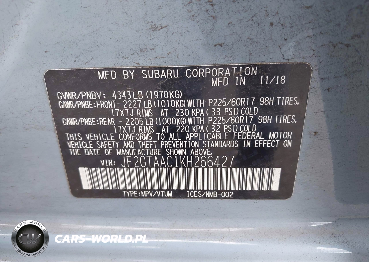 IAAI Nr: I-44297744 VIN: JF2GTAAC1KH266427 Port: Los Angeles, CA