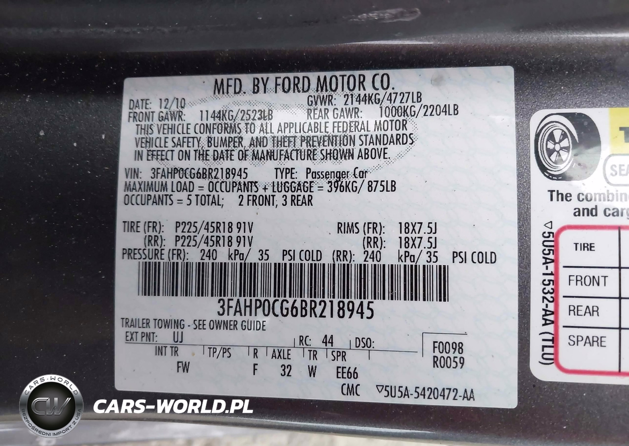 IAAI Nr: I-44331009 VIN: 3FAHP0CG6BR218945 Port: Elizabeth, NJ