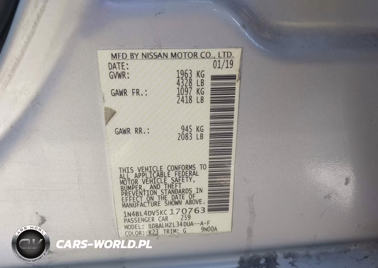 IAAI Nr: I-44337467 VIN: 1N4BL4DV5KC170763 Port: Houston, TX