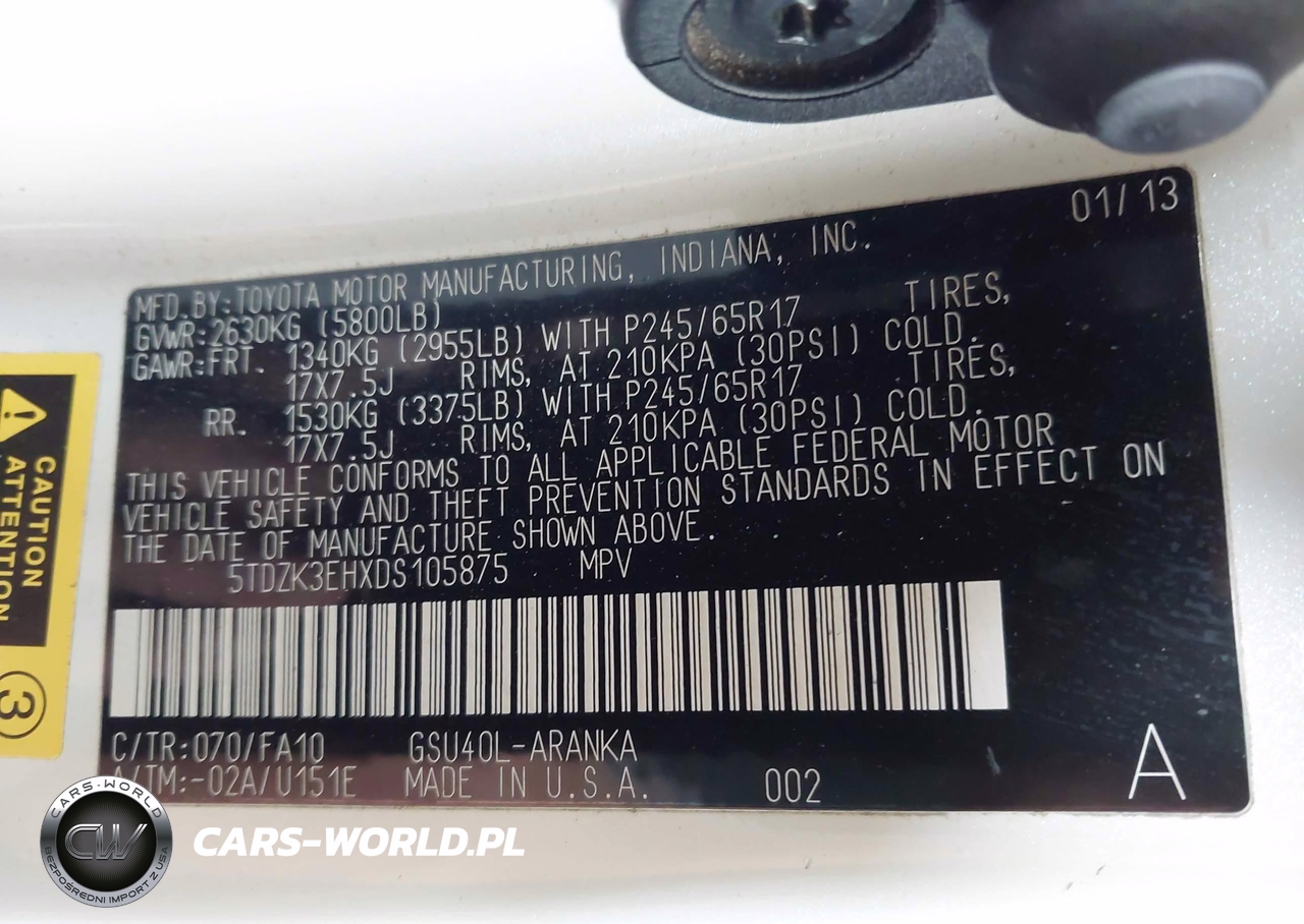 IAAI Nr: I-44346496 VIN: 5TDZK3EHXDS105875 Port: Los Angeles, CA