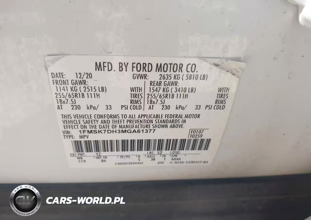 IAAI Nr: I-44357996 VIN: 1FMSK7DH3MGA61377 Port: Houston, TX
