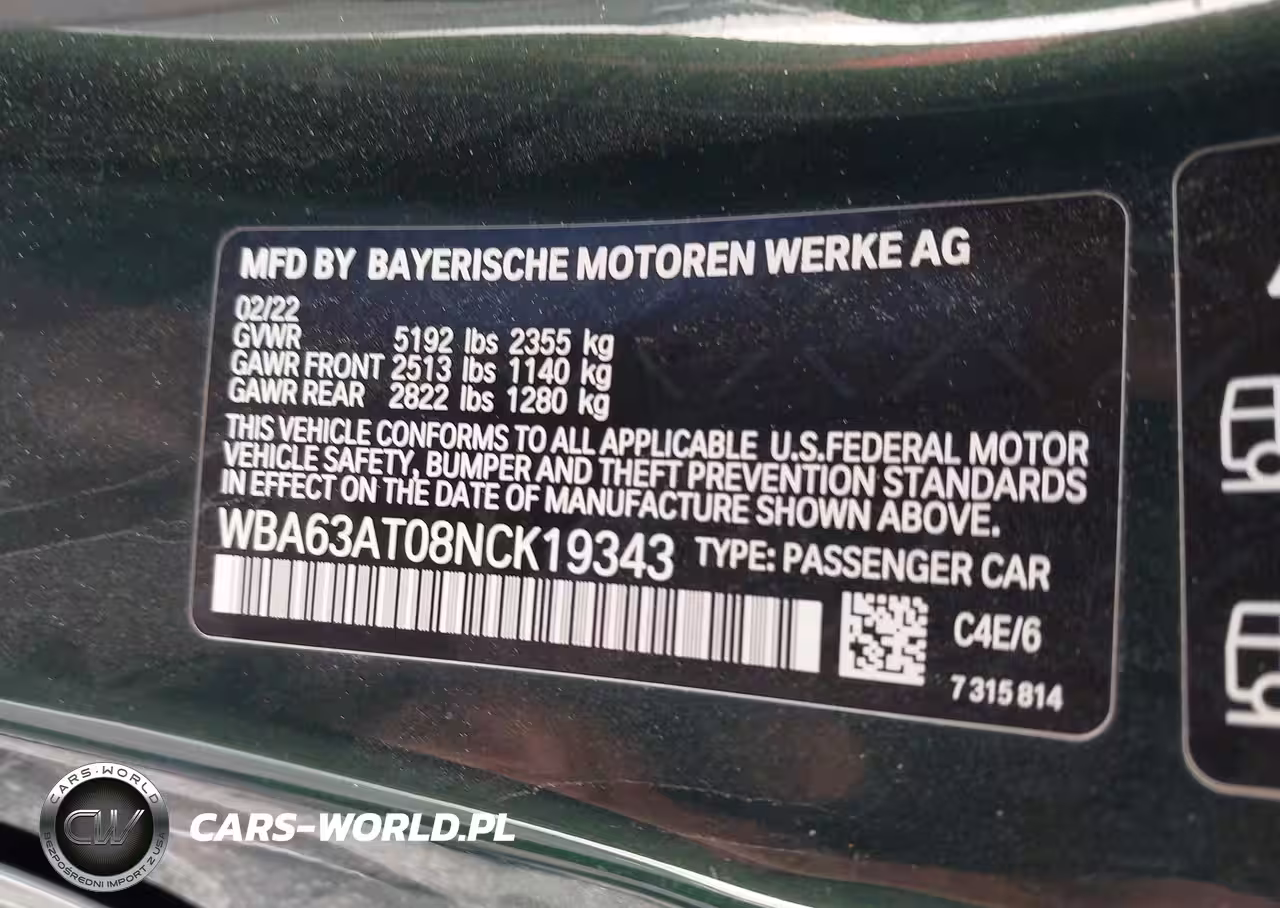 IAAI Nr: I-44360352 VIN: WBA63AT08NCK19343 Port: Savannah, GA