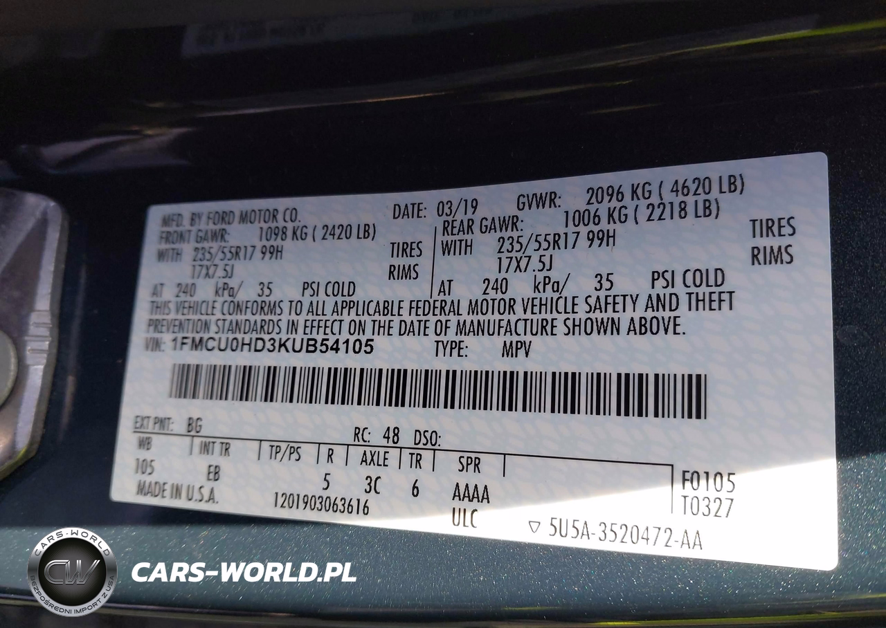 IAAI Nr: I-44371134 VIN: 1FMCU0HD3KUB54105 Port: Indianapolis, IN