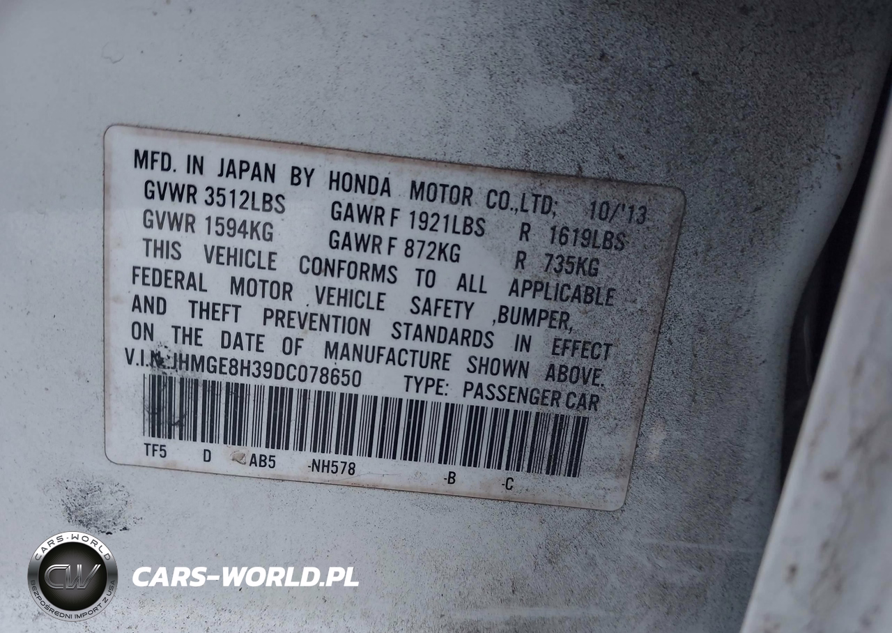 IAAI Nr: I-44378609 VIN: JHMGE8H39DC078650 Port: Savannah, GA