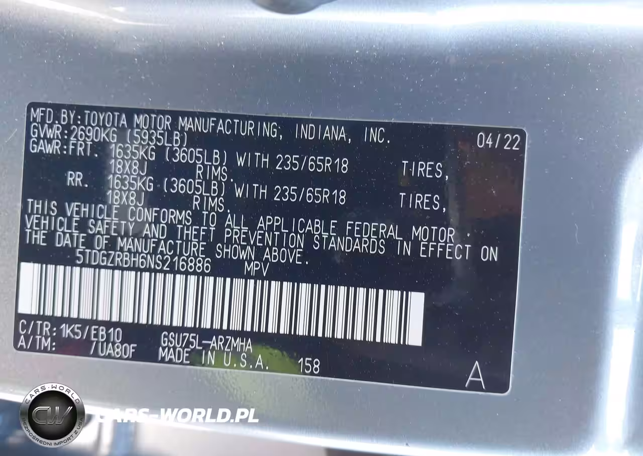IAAI Nr: I-44387267 VIN: 5TDGZRBH6NS216886 Port: Savannah, GA