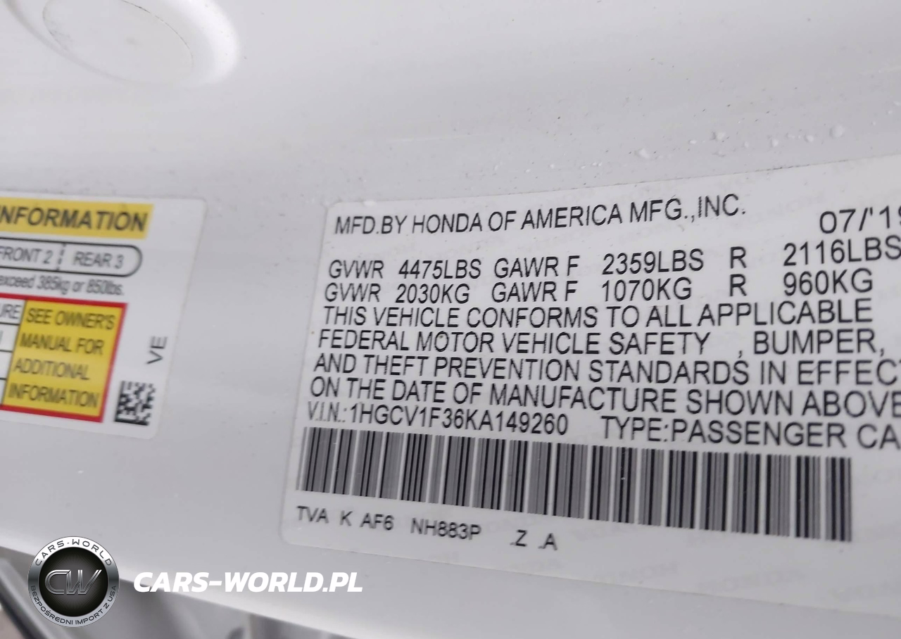 IAAI Nr: I-44394430 VIN: 1HGCV1F36KA149260 Port: Elizabeth, NJ