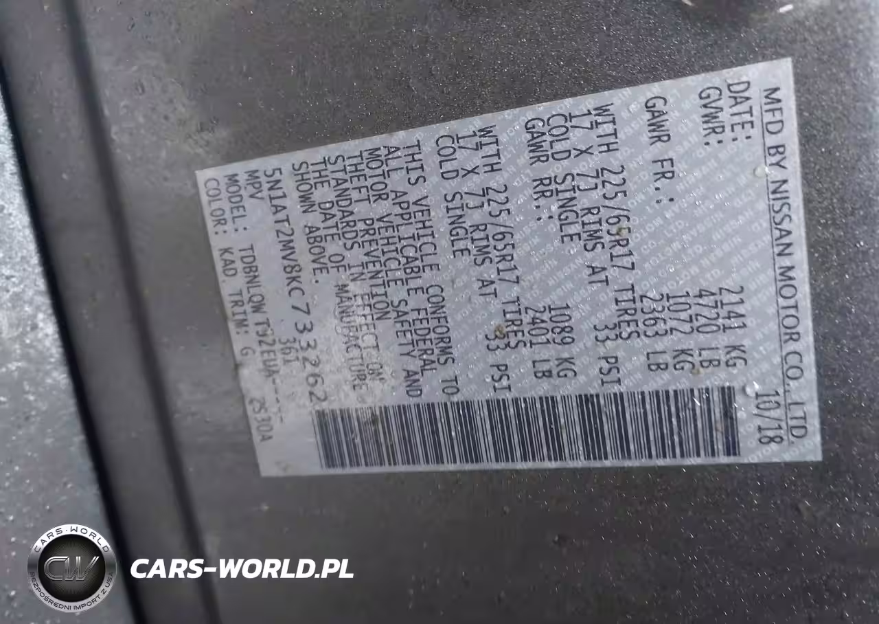 IAAI Nr: I-44398647 VIN: 5N1AT2MV8KC733262 Port: Elizabeth, NJ