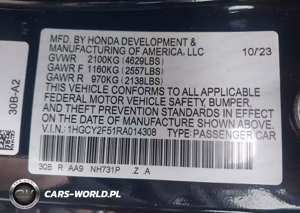 IAAI Nr: I-44407839 VIN: 1HGCY2F51RA014308 Port: Elizabeth, NJ