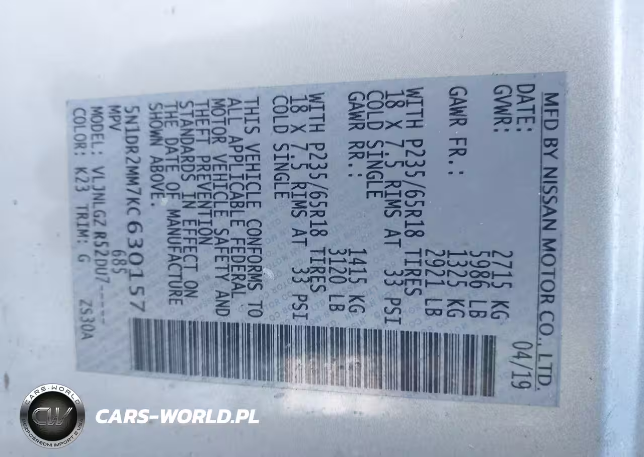 IAAI Nr: I-44430402 VIN: 5N1DR2MM7KC630157 Port: Elizabeth, NJ