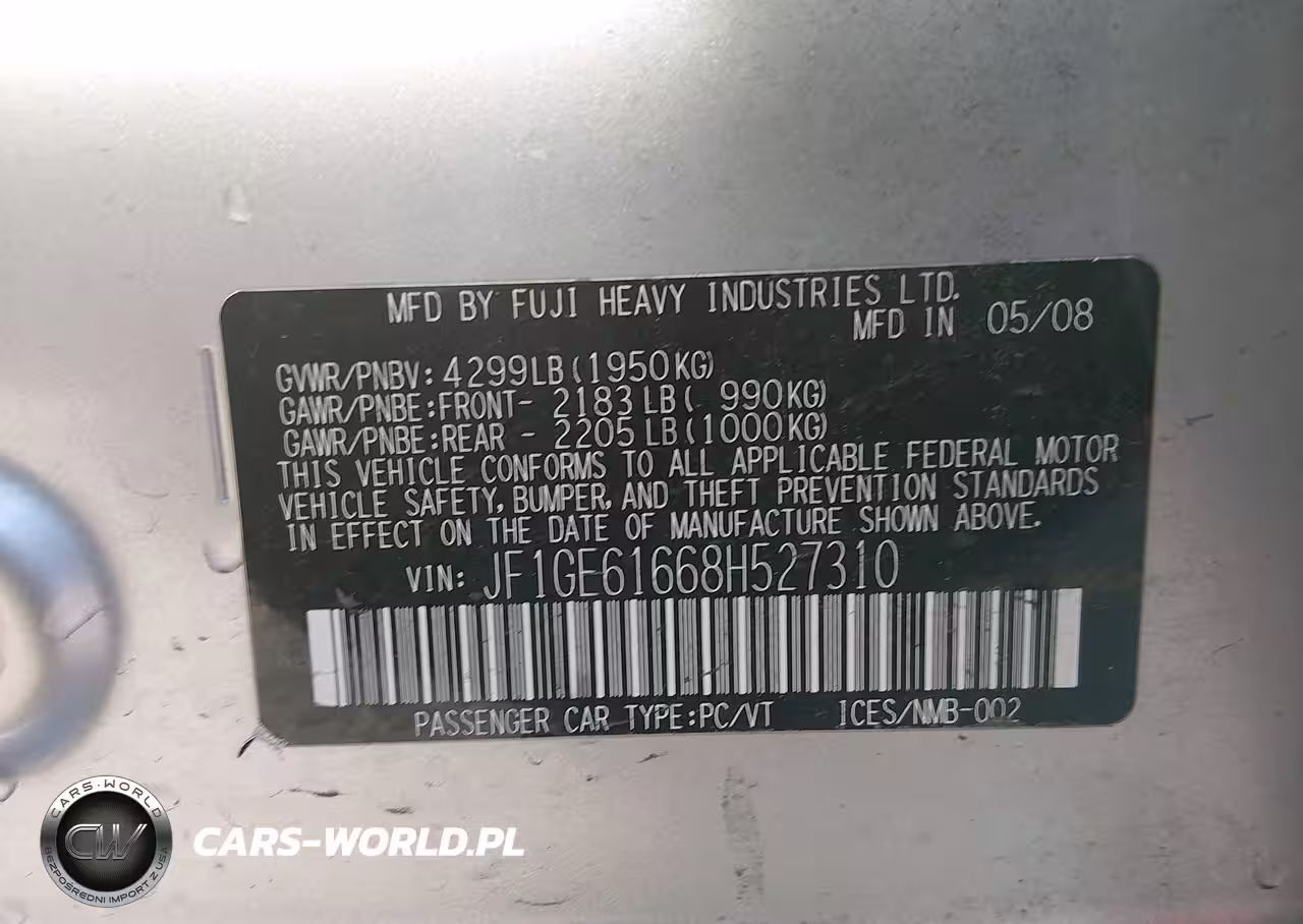 IAAI Nr: I-44433200 VIN: JF1GE61668H527310 Port: Houston, TX