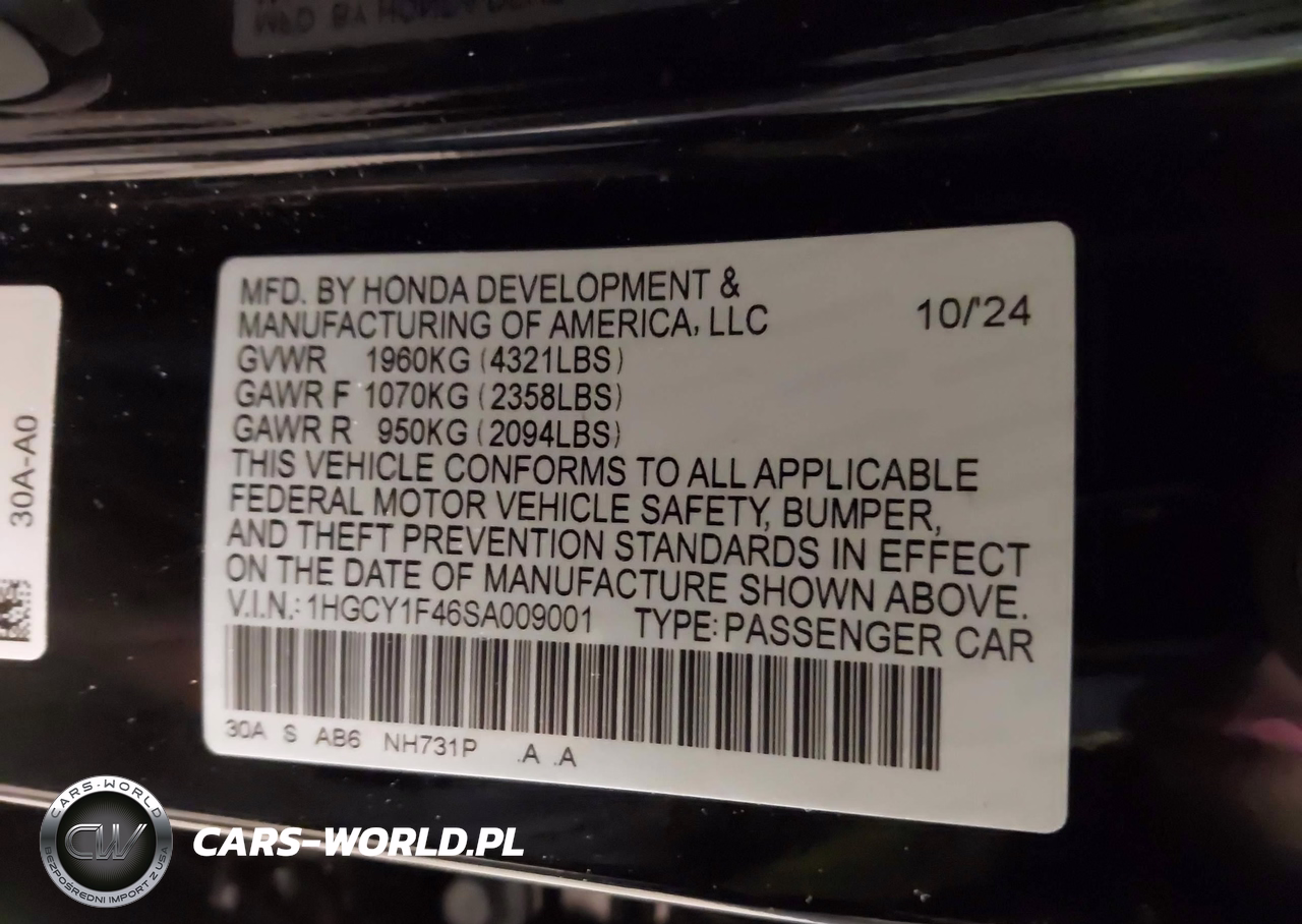 IAAI Nr: I-44444634 VIN: 1HGCY1F46SA009001 Port: Elizabeth, NJ