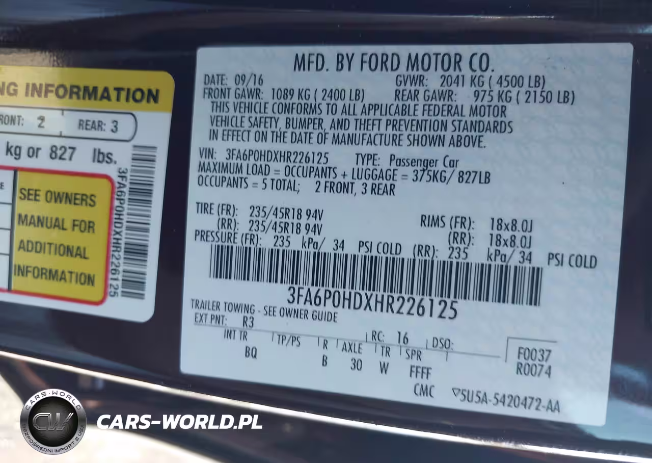 IAAI Nr: I-44446177 VIN: 3FA6P0HDXHR226125 Port: Elizabeth, NJ