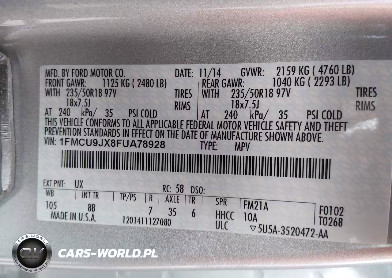 IAAI Nr: I-44461743 VIN: 1FMCU9JX8FUA78928 Port: Savannah, GA
