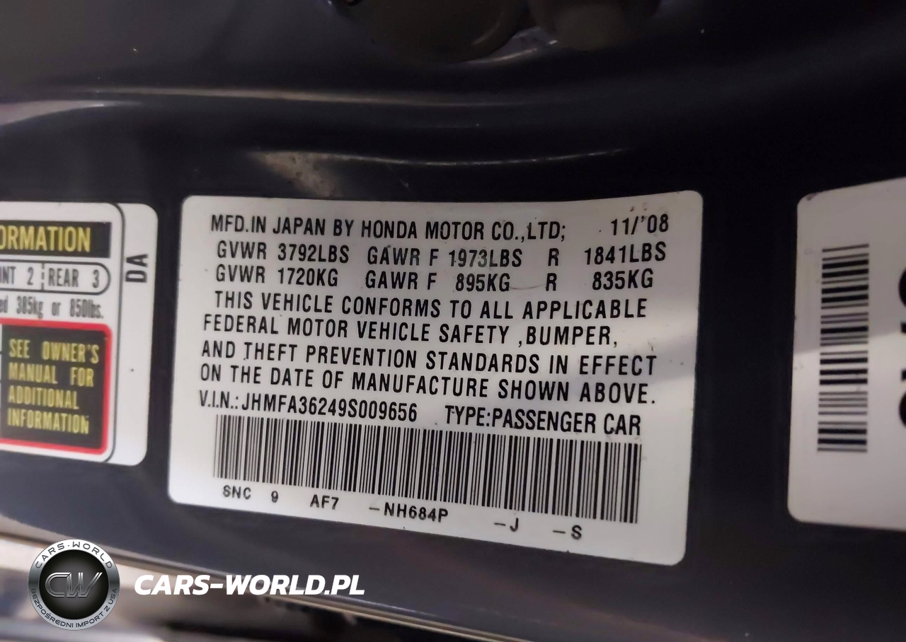 IAAI Nr: I-44462560 VIN: JHMFA36249S009656 Port: Indianapolis, IN