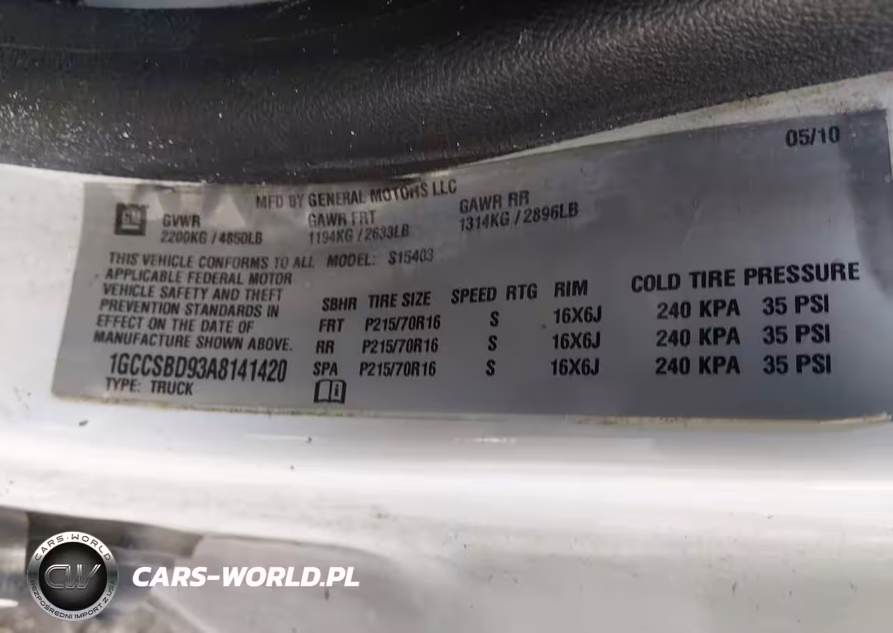 IAAI Nr: I-44466537 VIN: 1GCCSBD93A8141420 Port: Elizabeth, NJ