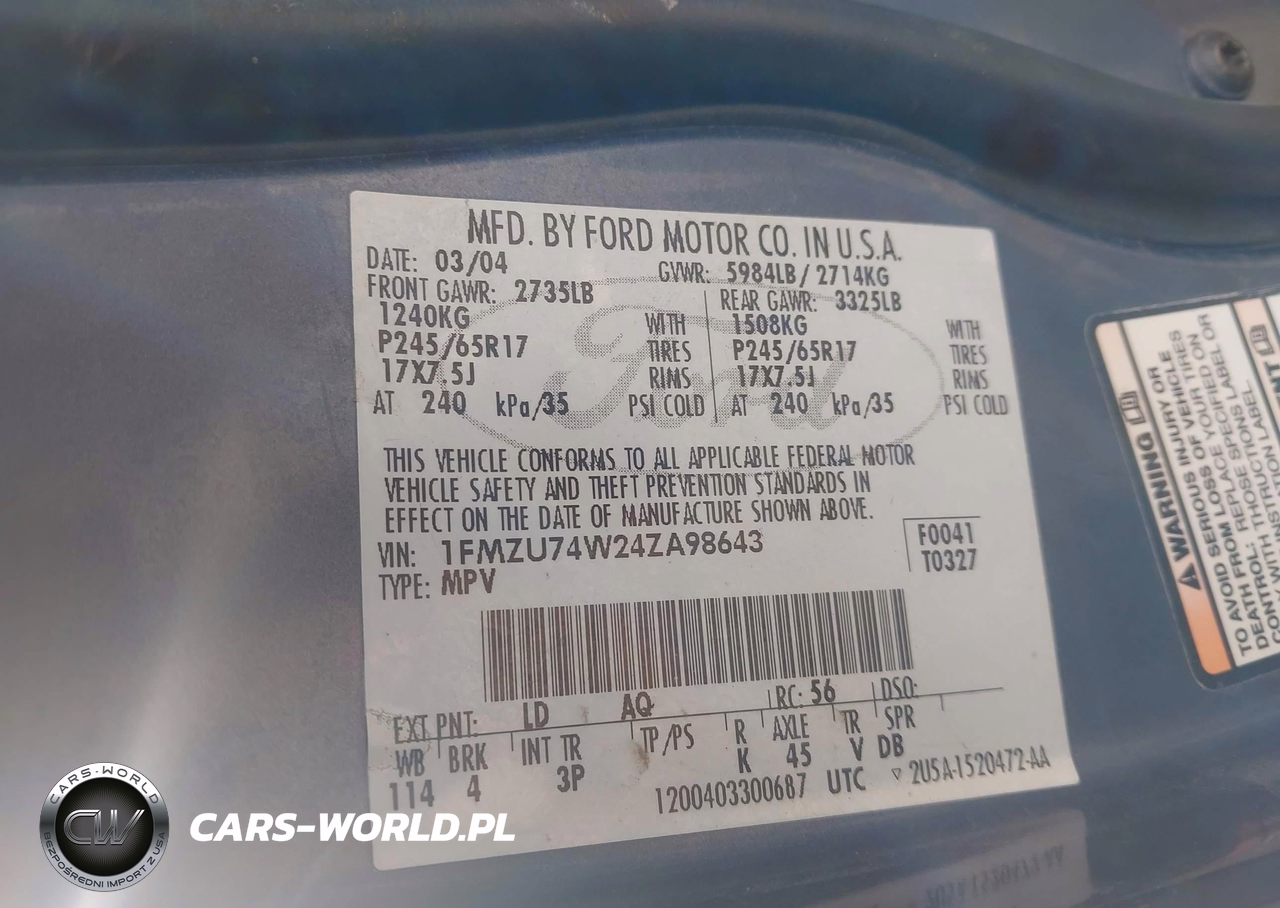 IAAI Nr: I-44473700 VIN: 1FMZU74W24ZA98643 Port: Indianapolis, IN