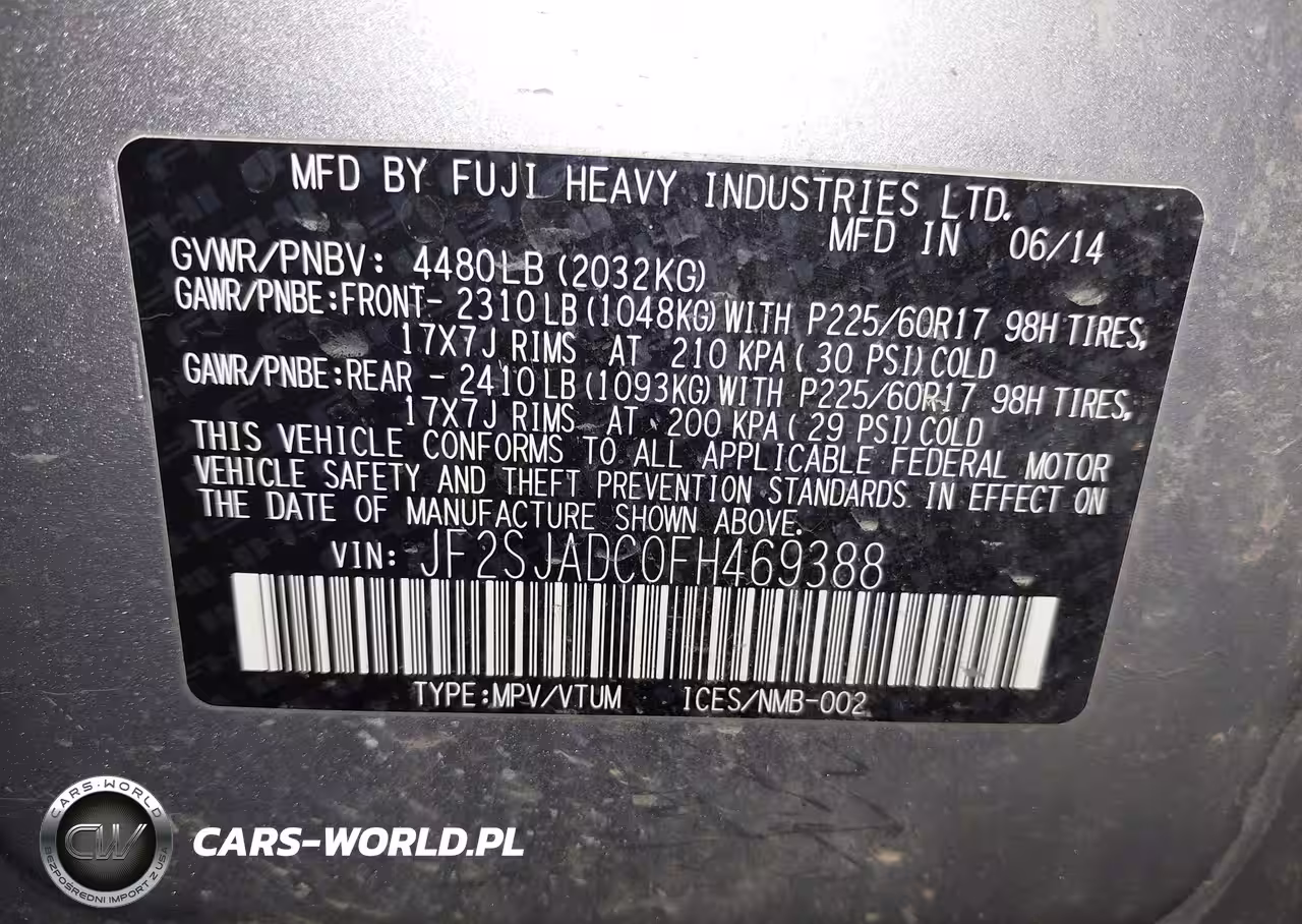 IAAI Nr: I-44477240 VIN: JF2SJADC0FH469388 Port: Indianapolis, IN