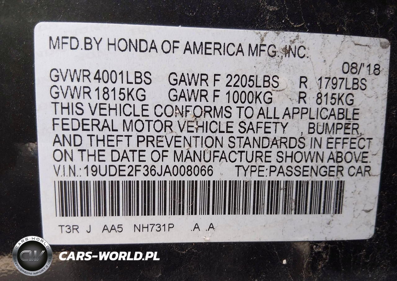 IAAI Nr: I-44480068 VIN: 19UDE2F36JA008066 Port: Elizabeth, NJ