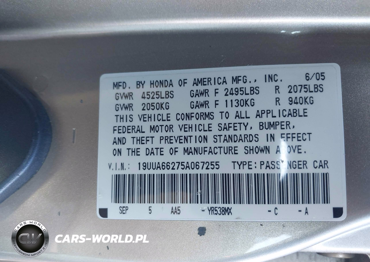 IAAI Nr: I-44480890 VIN: 19UUA66275A067255 Port: Indianapolis, IN