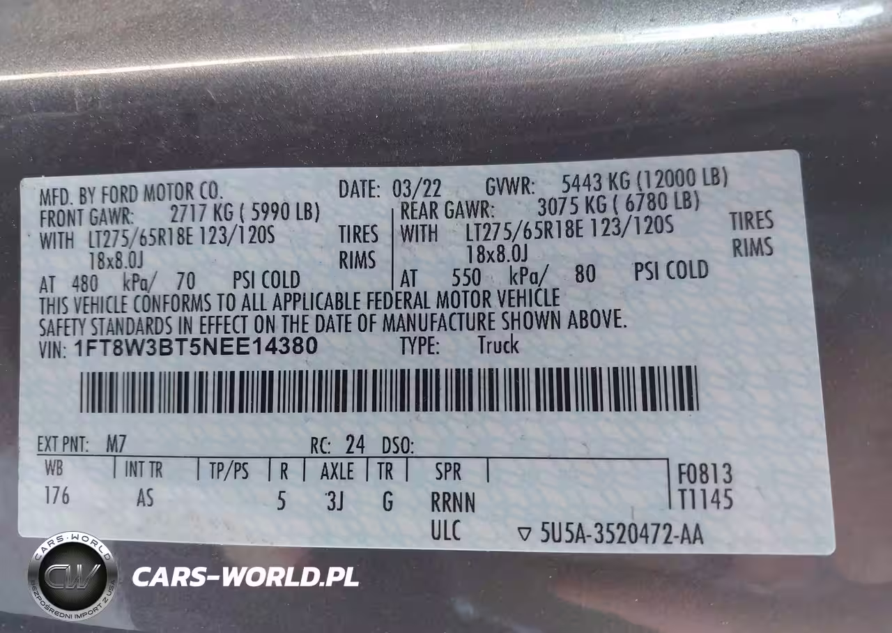 IAAI Nr: I-44487639 VIN: 1FT8W3BT5NEE14380 Port: Savannah, GA