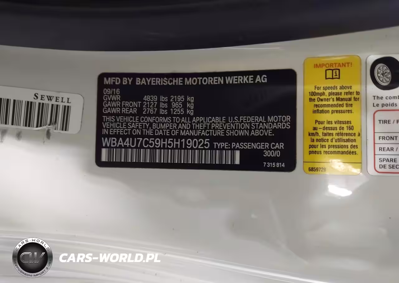 IAAI Nr: I-44489723 VIN: WBA4U7C59H5H19025 Port: Los Angeles, CA