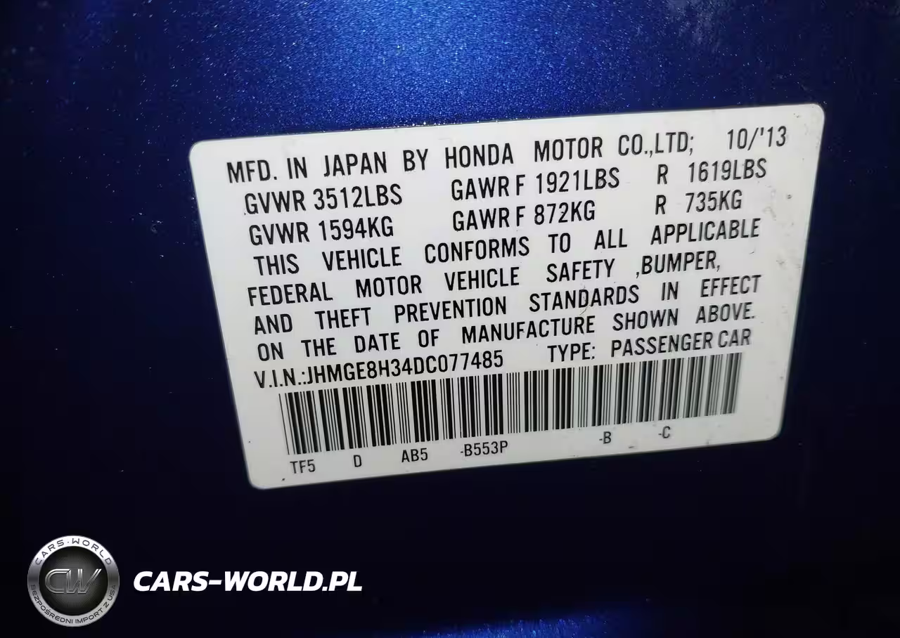 IAAI Nr: I-44497819 VIN: JHMGE8H34DC077485 Port: Los Angeles, CA