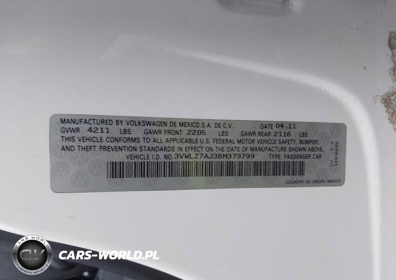 IAAI Nr: I-44498409 VIN: 3VWLZ7AJ3BM379799 Port: Elizabeth, NJ