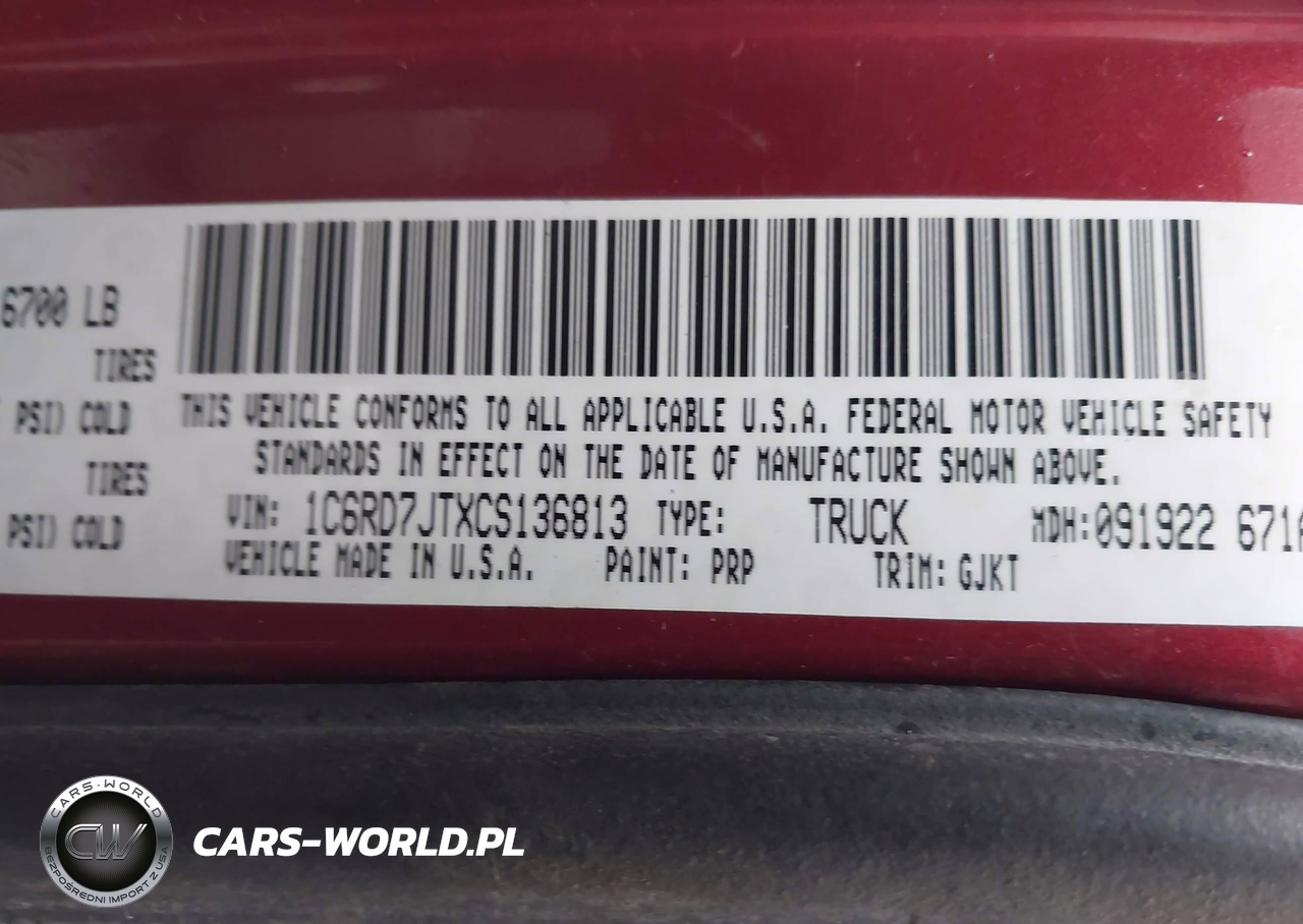 IAAI Nr: I-44498547 VIN: 1C6RD7JTXCS136813 Port: Indianapolis, IN