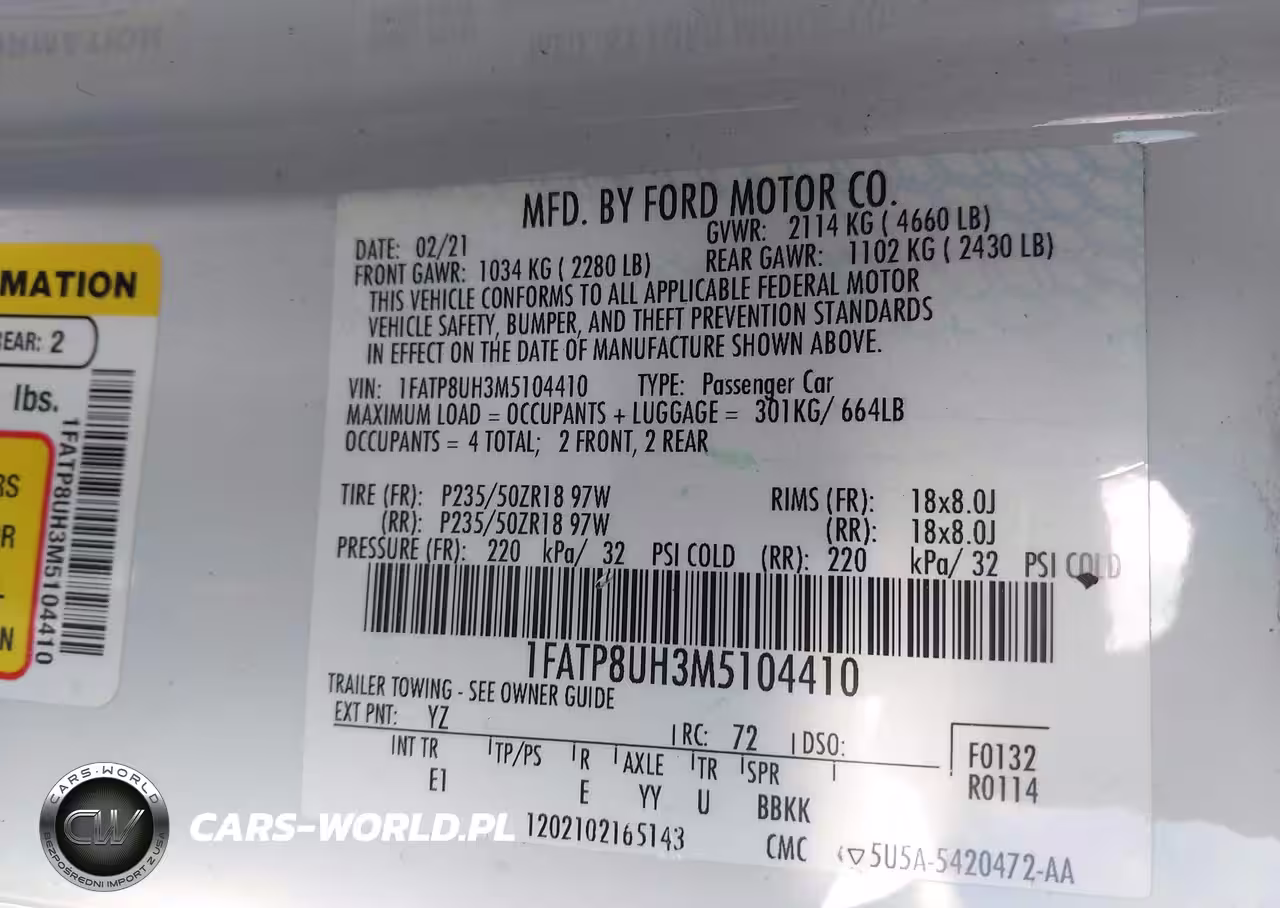 IAAI Nr: I-44500700 VIN: 1FATP8UH3M5104410 Port: Los Angeles, CA