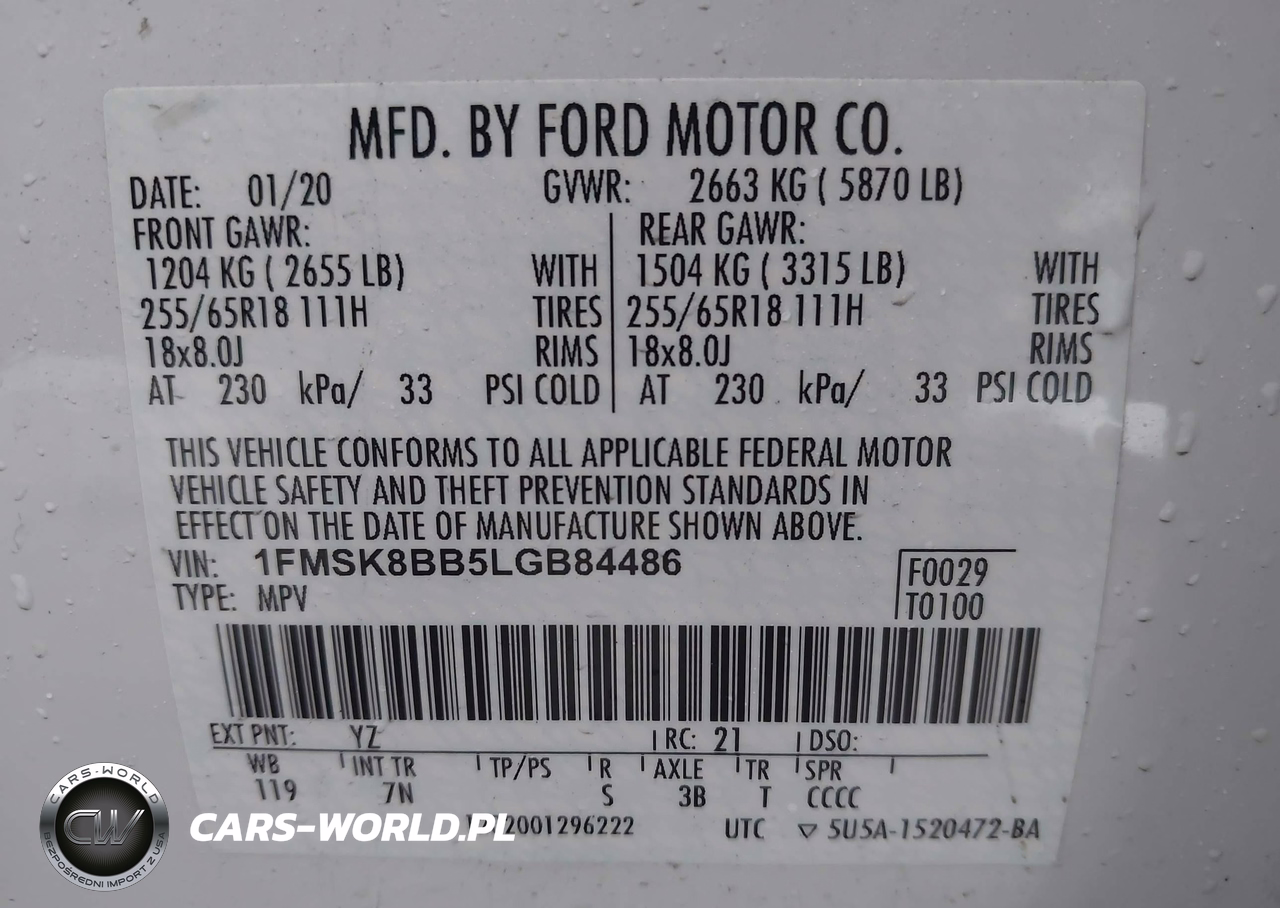 IAAI Nr: I-44501463 VIN: 1FMSK8BB5LGB84486 Port: Elizabeth, NJ