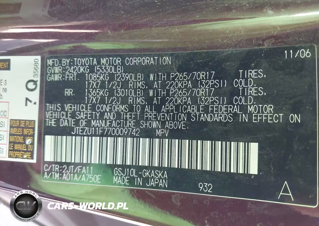 IAAI Nr: I-44503415 VIN: JTEZU11F770009742 Port: Houston, TX