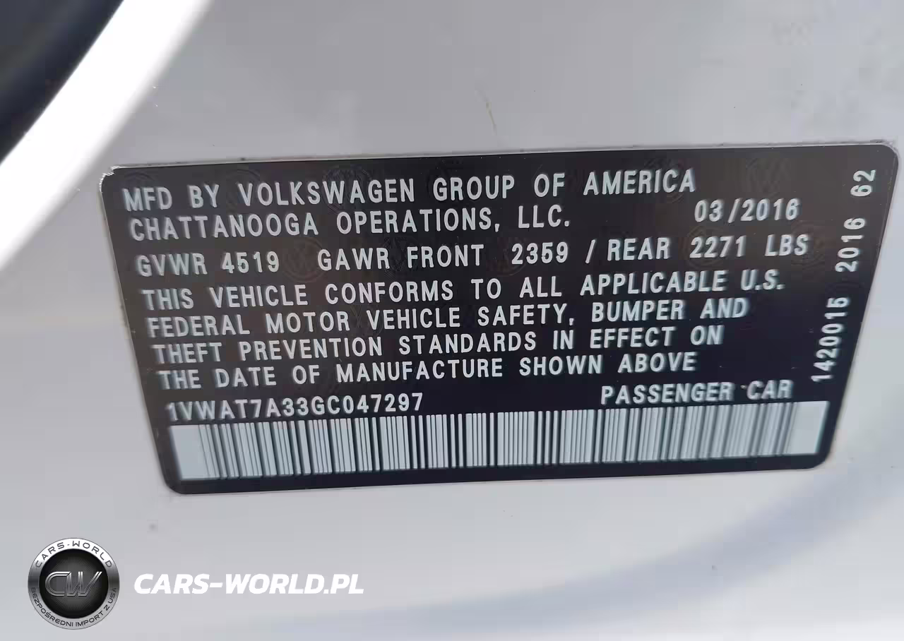 IAAI Nr: I-44507071 VIN: 1VWAT7A33GC047297 Port: Savannah, GA