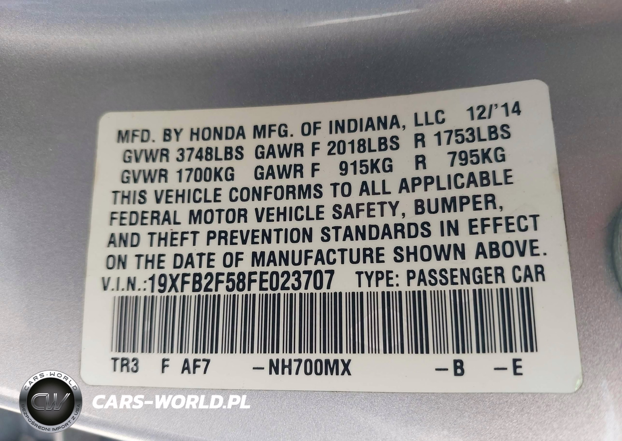 IAAI Nr: I-44511133 VIN: 19XFB2F58FE023707 Port: Houston, TX