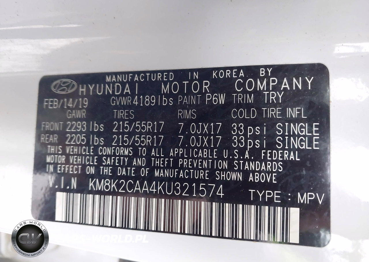 IAAI Nr: I-44513053 VIN: KM8K2CAA4KU321574 Port: Elizabeth, NJ
