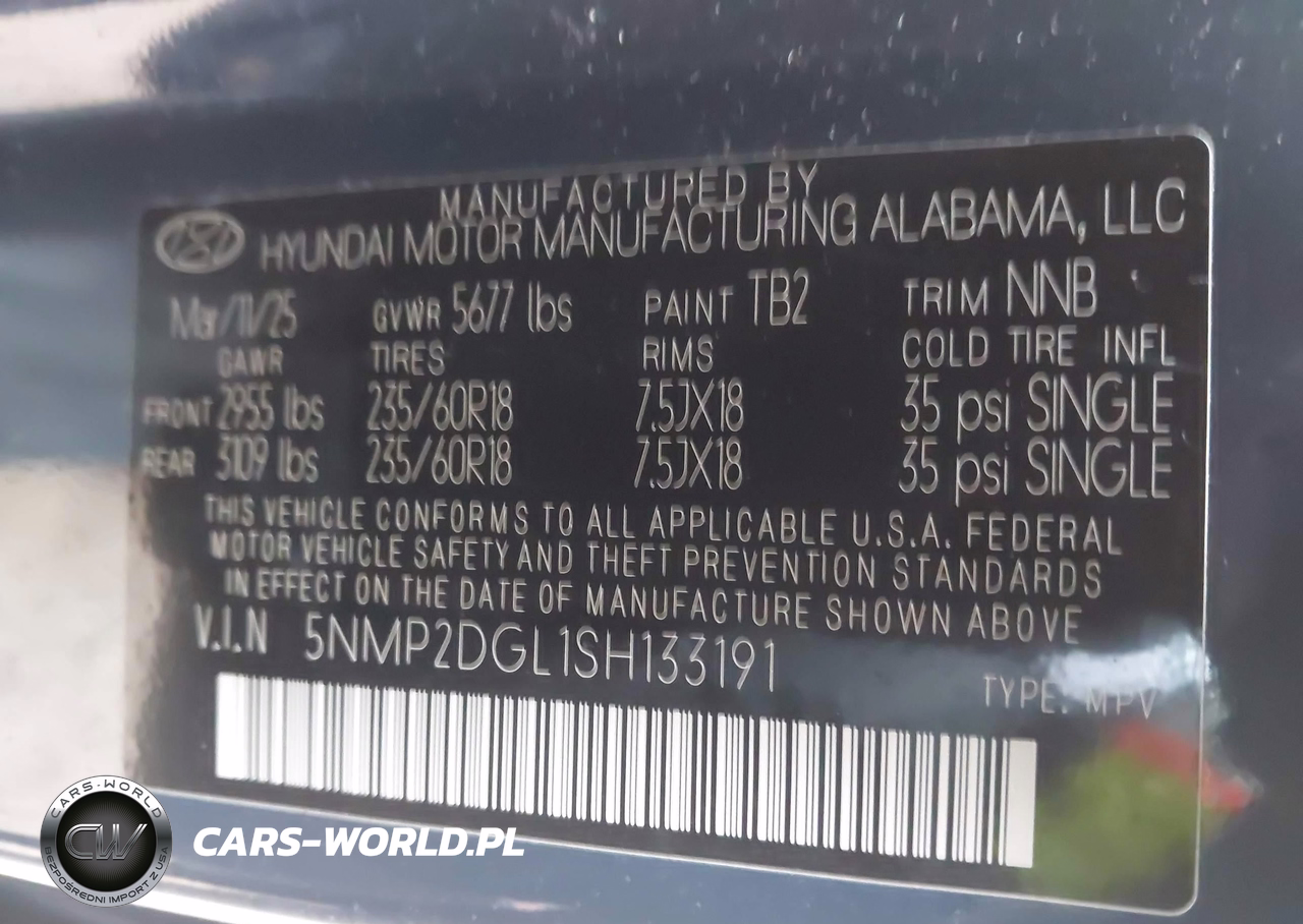 IAAI Nr: I-44518817 VIN: 5NMP2DGL1SH133191 Port: Elizabeth, NJ