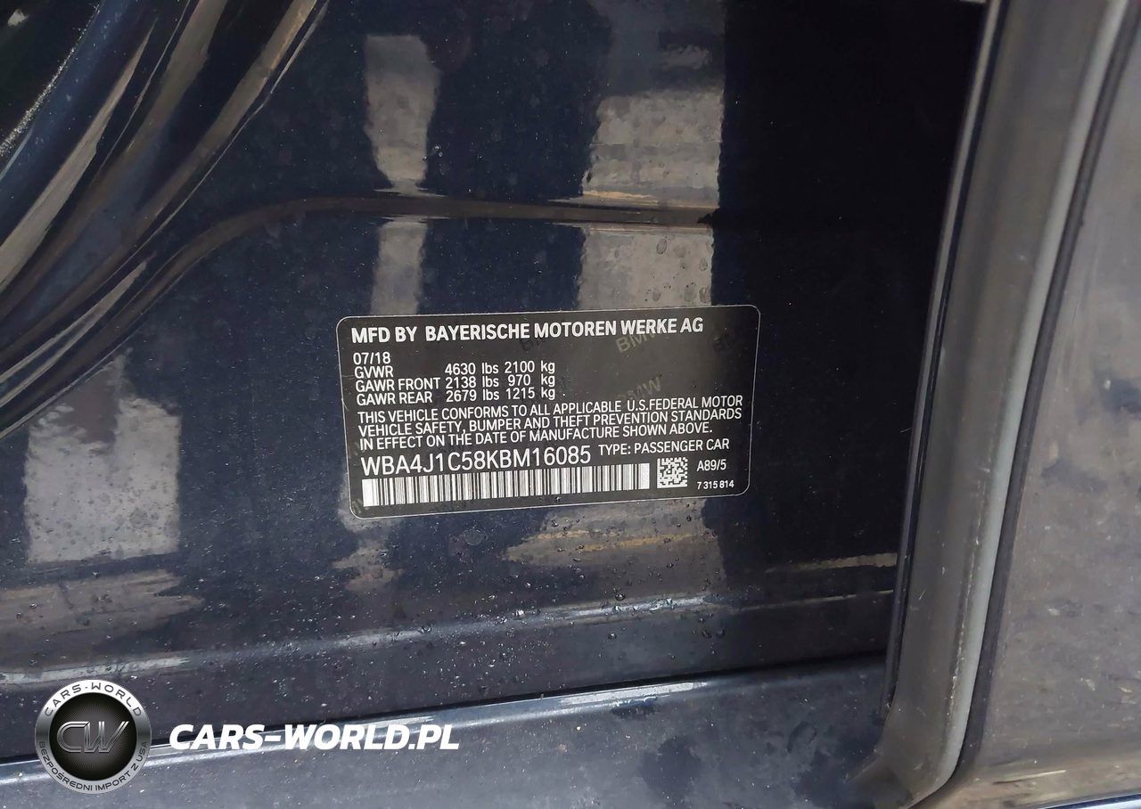 IAAI Nr: I-44520725 VIN: WBA4J1C58KBM16085 Port: Savannah, GA