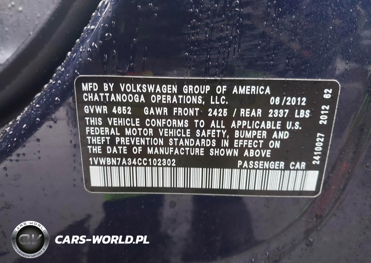 IAAI Nr: I-44529363 VIN: 1VWBN7A34CC102302 Port: Elizabeth, NJ