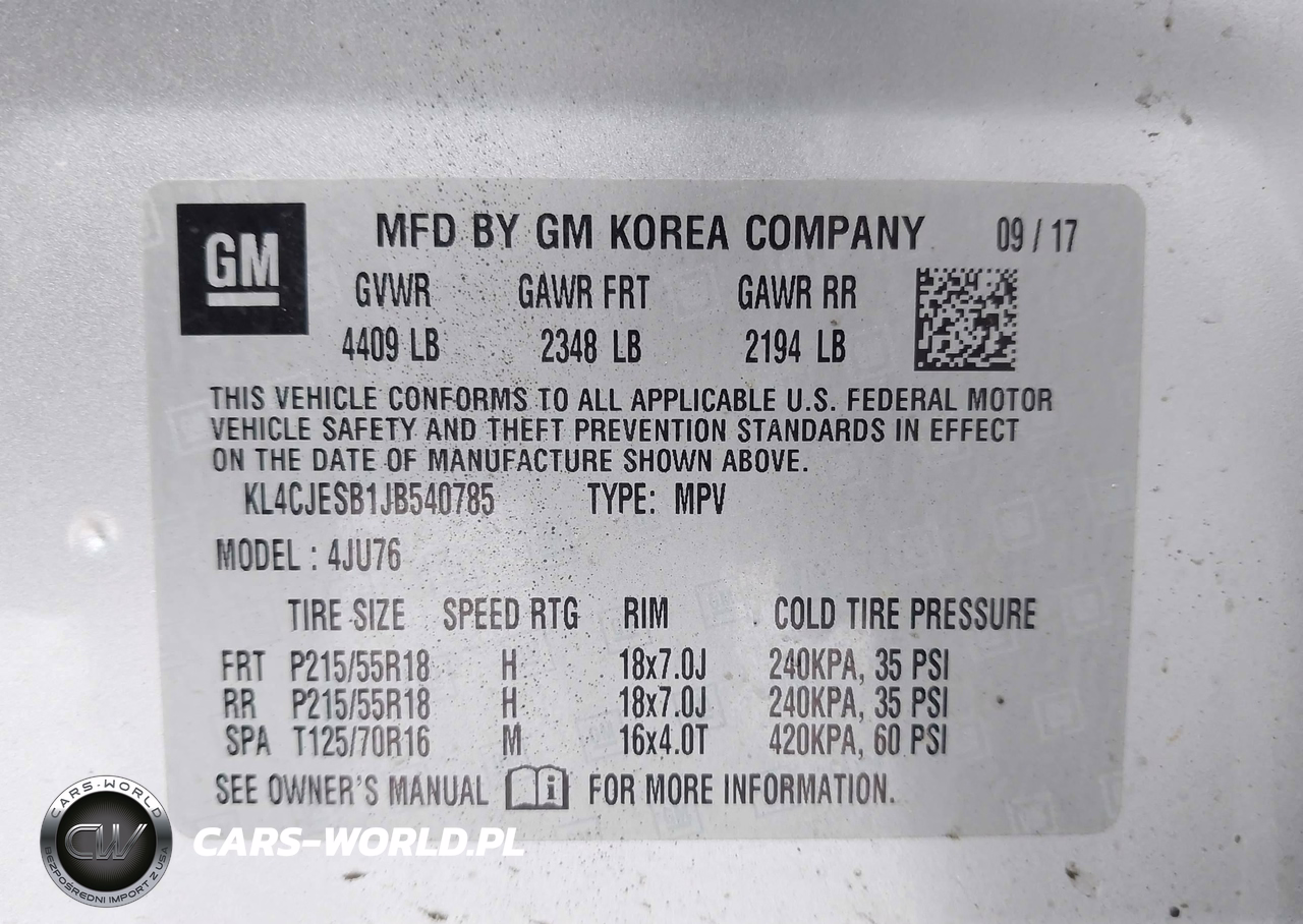 IAAI Nr: I-44529538 VIN: KL4CJESB1JB540785 Port: Elizabeth, NJ