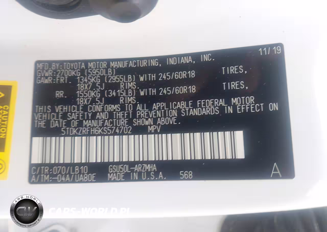 IAAI Nr: I-44532420 VIN: 5TDKZRFH6KS574702 Port: Savannah, GA