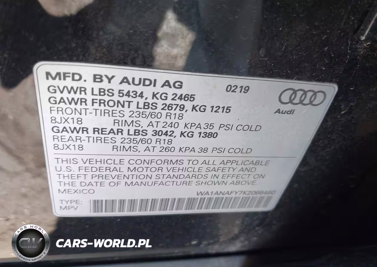 IAAI Nr: I-44538311 VIN: WA1ANAFY7K2066460 Port: Elizabeth, NJ