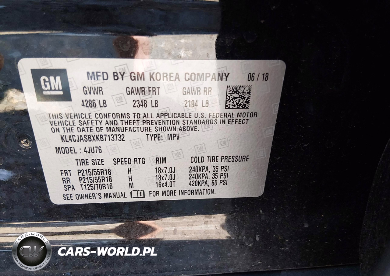 IAAI Nr: I-44540163 VIN: KL4CJASBXKB713732 Port: Savannah, GA