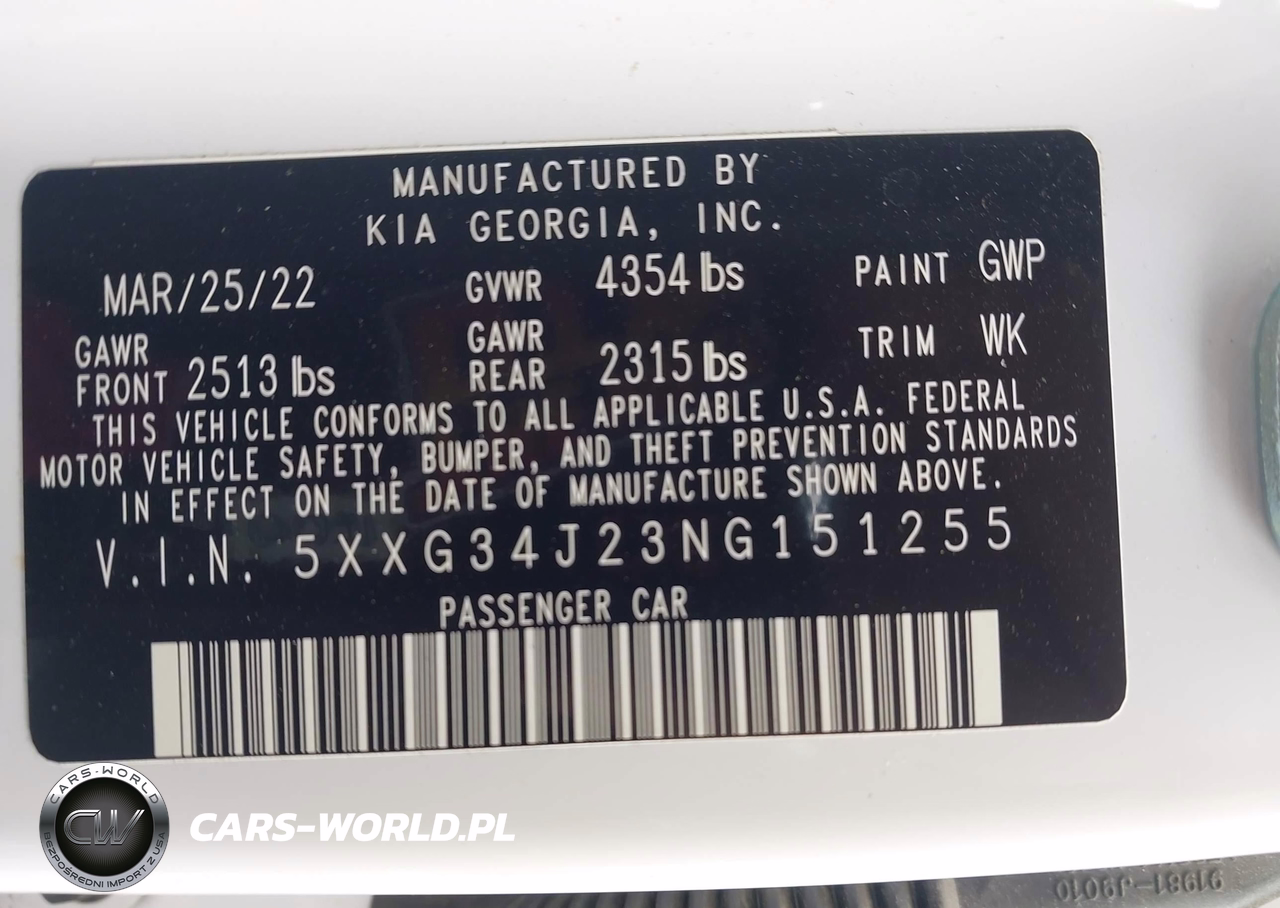 IAAI Nr: I-44540780 VIN: 5XXG34J23NG151255 Port: Houston, TX
