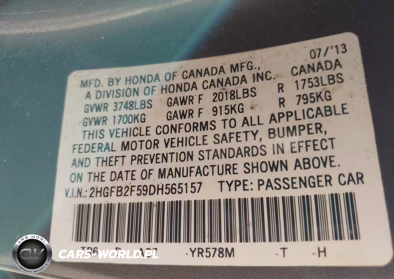 IAAI Nr: I-44547229 VIN: 2HGFB2F59DH565157 Port: Savannah, GA