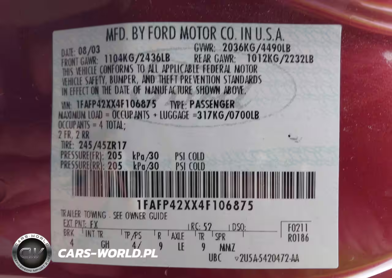 IAAI Nr: I-44547429 VIN: 1FAFP42XX4F106875 Port: Houston, TX