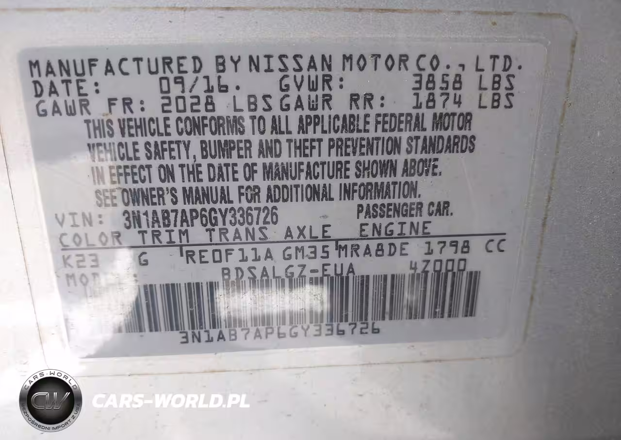 IAAI Nr: I-44550529 VIN: 3N1AB7AP6GY336726 Port: Savannah, GA