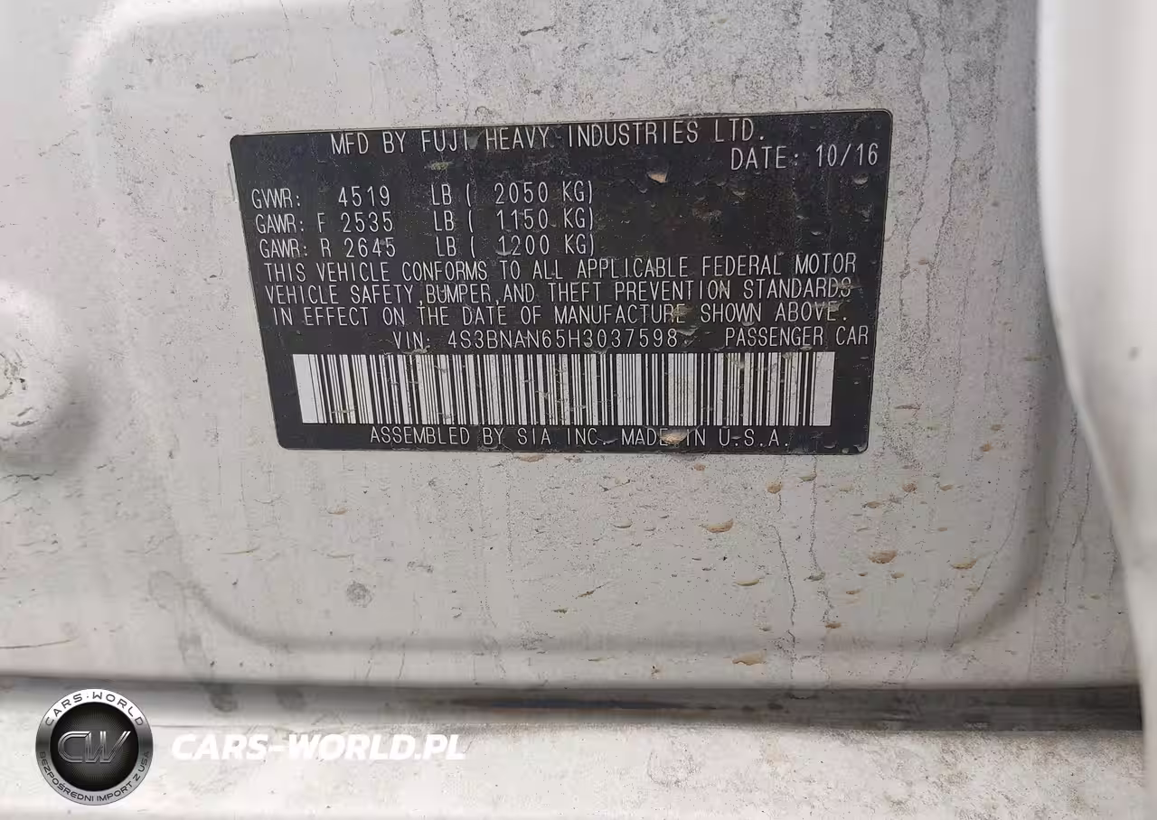 IAAI Nr: I-44551196 VIN: 4S3BNAN65H3037598 Port: Savannah, GA