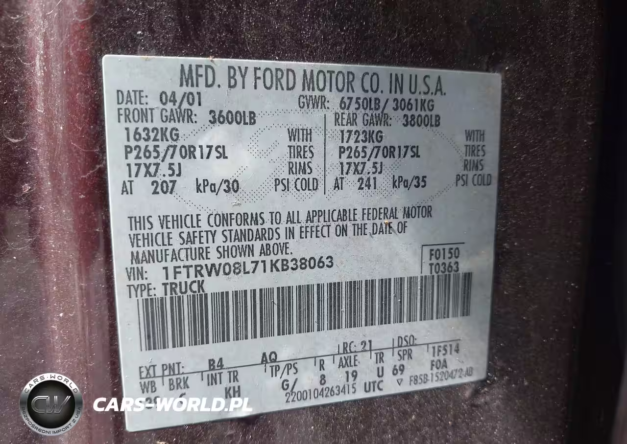 IAAI Nr: I-44557717 VIN: 1FTRW08L71KB38063 Port: Savannah, GA