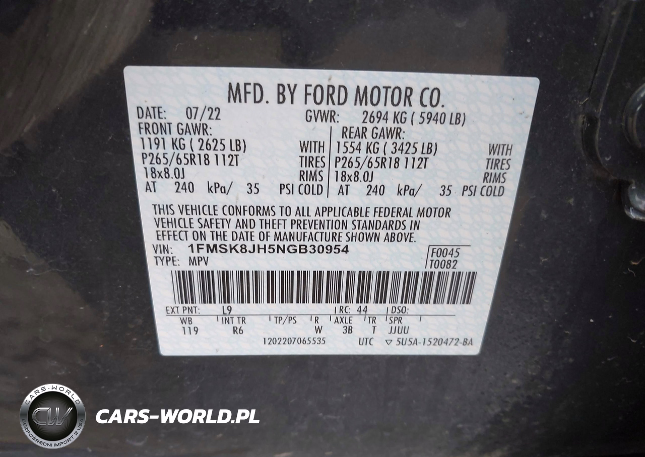 IAAI Nr: I-44558068 VIN: 1FMSK8JH5NGB30954 Port: Elizabeth, NJ